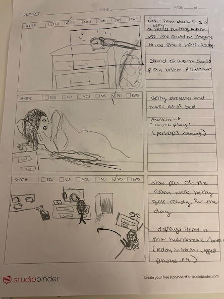 Props will definitely be a key feature of our opening scene, since we plan on revealing a lot about the situation using Betty's bedroom as a tool to "show" rather than "tell". Most of the props we plan on having revolve around the idea of heartbreak. Betty's room should have a teddy bear in the trash, old and wrinkled love letters, ripped-in-half photos of Betty and James, wilted flowers, and many more prop ideas that we'll come up with. Props not related to heartbreak include Betty's phone or alarm clock to wake her up, a hairbrush to use, and makeup to apply in front of the mirror. James will likely be holding flowers in front of Betty at her doorstep, so this would also be a prop we planned.